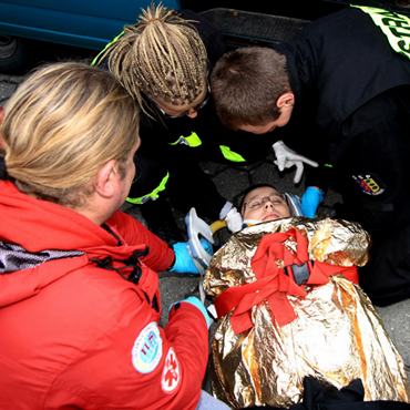 Na koniec konkursu uczestnicy wzięli udział w zdarzeniu masowym, jako pozoranci. Mieli okazję zapoznać się w praktyce z zasadami ratownictwa w wypadku drogowym oraz poznali TRIAGE (segregację w wypadku masowym).