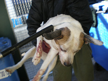 Dziś tj. 26.11.2009 przy ul. Rybaki przypadkowo zauważono w śmietniku ledwo żywego psa. Pies został okrutnie skatowany, wyrzucony do śmietnika i dla pewności, że nikt go nie znajdzie - przysypany stertą śmieci.