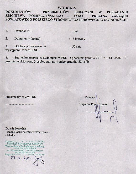 Dziś (7 lutego 2014 r.) do siedziby wojewódzkiego PSL w Szczecinie dotarło oświadczenie Zbigniewa Pomieczyńskiego o wystąpieniu z partii. Razem z nim ze Stronnictwem żegna się 51 członków świnoujskich struktur partii.