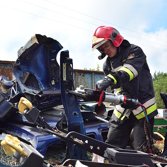 Na wraku niebieskiego volvo strażacy ćwiczyli otwieranie drzwi przy pomocy specjalistycznego sprzętu hydraulicznego. Wszystko po to, aby w razie wypadku dostać się do ewentualnego poszkodowanego. W ćwiczeniach udział wzięli świnoujscy strażacy.