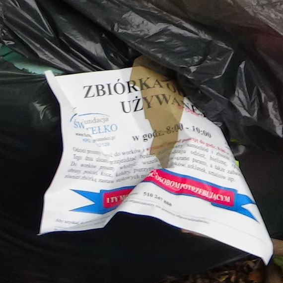 Na drugim zdjęciu widoczna jest karteczka, która wyraźnie wskazuje dla kogo lub przez kogo była prowadzona zbiórka używanej odzieży. Insynuacje zawarte w artykule świadczą o bardzo niskim poziomie intelektu mieszkańca i niestety autora samego artykułu. Wstyd, po prosty WSTYD.