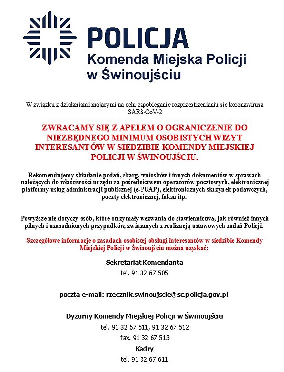 Powyższe nie dotyczy osób, które otrzymały wezwania do stawiennictwa, jak również innych pilnych i uzasadnionych przypadków, związanych z realizacją ustawowych zadań Policji.
