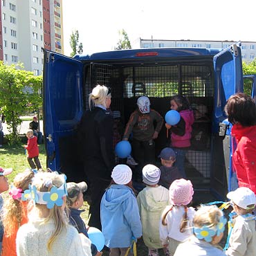 Dzieci radośnie przywitały Policjantów mottem: „Nie zapomnij o przyrodzie i bezpieczeństwie – niezapominajka Ci pomoże”. Dzieci chętnie i trafnie opowiadały jak należy zachowywać się na przejściu dla pieszych, jak w kontakcie z osobą obcą, a jak w przypadku napotkania agresywnego zwierzęcia. Pytaniom o naszą pracę, radiowozy, psy służbowe nie było końca. Prawie każdy przedszkolak deklarował, że kiedy dorośnie zostanie policjantem. Najwięcej emocji wzbudziło „kierowanie radiowozem”. Zarówno dziewczynki jak i chłopcy chcieli choć przez chwilę posiedzieć za kierownicą samochodu policyjnego.