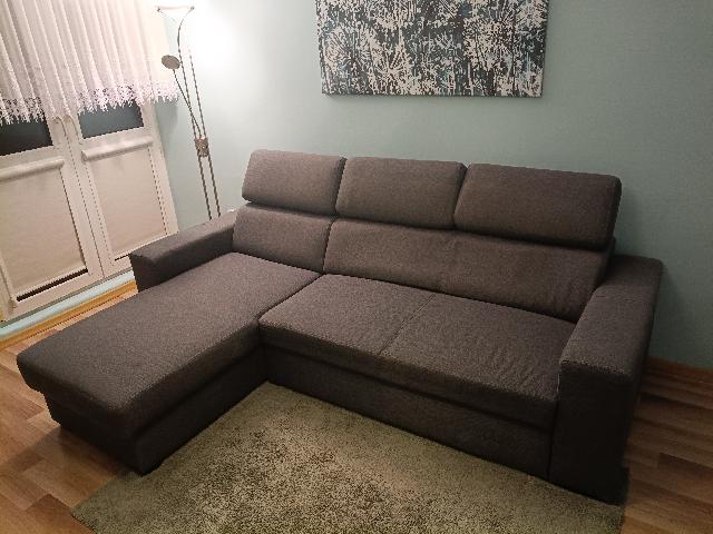 sprzedam naro¿nik szary stan dobry 2.4m x 1.57m funkcja spania, skrzynia na po¶ciel. Ustawienie lewe lub prawe.