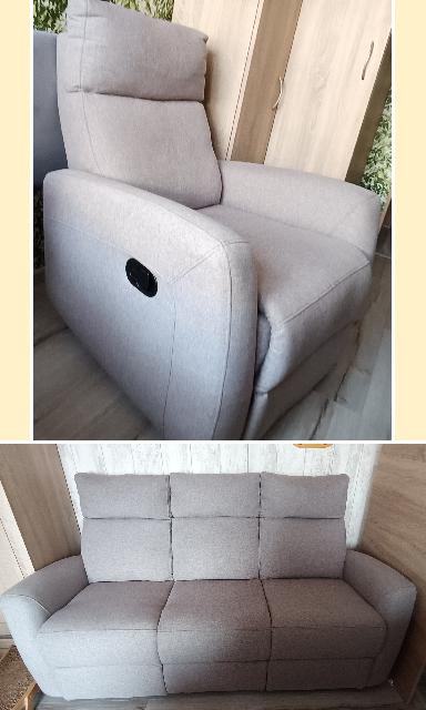Sprzedam fotel i sofê, rozk³adane, z funkcj± Relaks., stan b. dobry. Dwa zewnêtrzne siedziska w kanapie rozk³adaj± siê podobnie, jak fotel, przy pomocy uchwytu, widocznego na zdjêciu. Cena: fotel 300 z³., sofa 400 z³. Do kompletu ew. drugi fotel, gratis (jest trochê bardziej u¿ytkowany). Proszê dzwoniæ, nie pisaæ sms.
