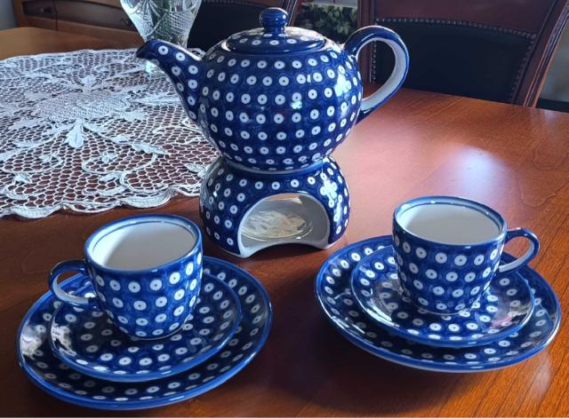 Piêkny komplet ceramiki boles³awieckiej w sk³ad którego wchodzi dzbanek z podgrzewaczem dwie fili¿anki z podstawkami i dwa talerzyki. Nowy ! nie u¿ywany !!! Odporny na zarysowania mo¿na myæ w zmywarce. Cena 330 z³