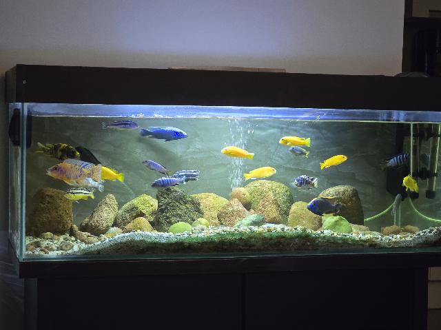Sprzedam akwarium 100x40x35 ze szk³a opti, z szafka (nowy blat), filtr roczny aquael ultramax, grza³ka, lampka, plus ok 30 pyszczakow Malawi.