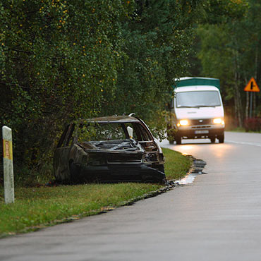 Wrak spalonego samochodu niebezpieczny dla kierowców