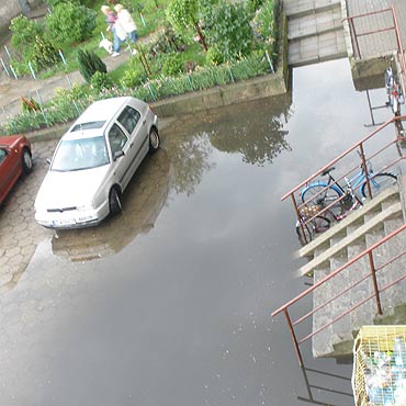 Możemy sobie żartować, że do bloku przy ul. Matejki 43 po ulewie można dopłynąć tylko kajakiem, że mieszkańcy muszą nurkować do samochodów itp. Lokatorom jednak nie bardzo jest do śmiechu, kiedy po każdym deszczu przed klatką tworzy się ogromna kałuża. Na domiar złego podmywany jest też śmietnik i odpadki pływają po chodniku.