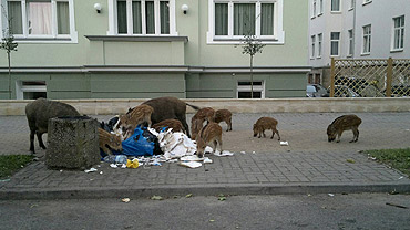 Dzikie zwierzęta nie byłyby tak odważne, gdyby nie śmieciarz, który podrzucił pod uliczną śmietniczkę worek pełny resztek jedzenia.