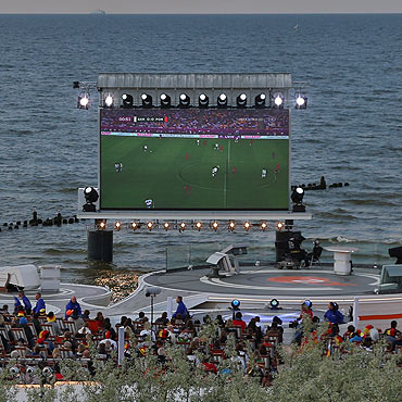Potężny telebim wynurzający się z przybrzeżnych wód Bałtyku, niemniej imponujące nagłośnienie, ogromna platforma ze stanowiskami komentatorskimi to najważniejsze fragmenty tej robiącej wrażenie konstrukcji. Z myślą o kibicach z kolei rozstawiono setki koszy z których wygodnie można obserwować mecze. Dla celów plażowe studia zajęte zostało również sąsiednie molo. Tu zorganizowano małą gastronomię, stoliki dla gości strefy VIP, stanowiska dla fotoreporterów.