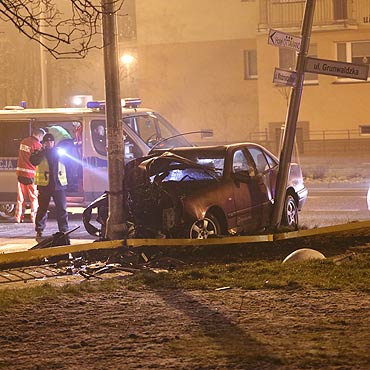 Ciemny mercedes jechał ulicą Grunwaldzką. Na skrzyżowaniu z ulicą Steyera uderzył w słup oświetleniowy. Wezwano pogotowie. Na miejscu zjawiła się też policja.