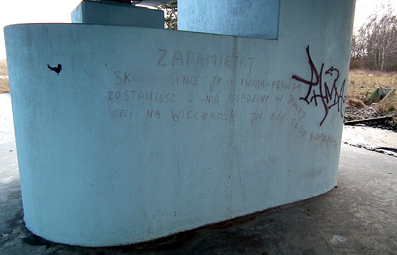 Ten napis, który znajduje się na jednym z filarów mostu do Karsiborza to najprawdopodobniej przesłanie do pana Romana Kuchcińskiego.(fot. Czytelnik