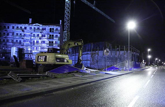 Wiatr odsłania kulisy budowy, gną się metalowe płoty