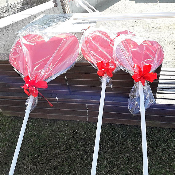 Aranżację placu stanowić będą różnego rodzaju ozdoby w kształcie serca: 15 sztuk lizaków o średnicach 60, 45 i 30 cm, 20 sztuk girland na latarnie uliczne, wianki wykonane z gałązek wikliny lub derenia do ozdobienia wież kwiatowych oraz wstążki i serca do ozdoby drzew rosnących na placu.