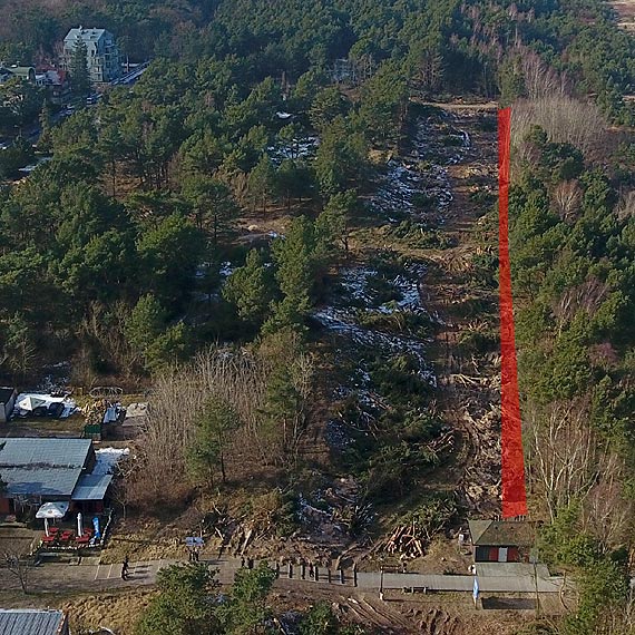 Teren zaznaczony na czerwonio jest sporem w wycince drzew między firmą DREW-KOS a Urzędem Miasta. Zdjęcie wykonane 16 lutego 2018 r.(fot. Andrzej Ryfczyński