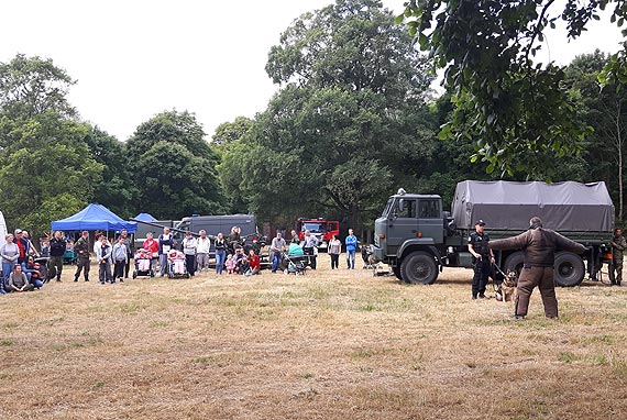 Najmłodsi mieli okazję oglądania pokazów policyjnego psa i jego opiekuna. Owczarek niemiecki stosował się do komend wydawanych przez przewodnika. W pokazach brał udział także pozorant ubrany w gruby ochraniacz, który imitował przestępcę i zadaniem czworonoga było go skutecznie zatrzymać. Policjanci wspólnie z dziećmi przećwiczyli pozycję na tzw. "żółwia", jaką należy przyjąć, aby urazy zdrowotne w przypadku ewentualnego pogryzienia były jak najmniej dotkliwe dla zdrowia, tj. uklęknąć, ukryć twarz, zasłonić dłońmi uszy i docisnąć ręce do tułowia.