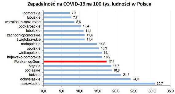 Najwyższe wskaźniki odnotowujemy w województwie: mazowieckie – 30,7; dolnośląskie – 24,0; łódzkie – 21,5.