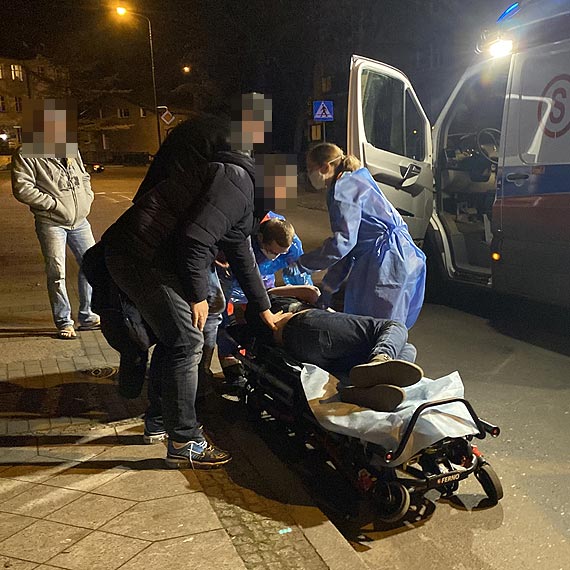 Upojeni alkoholem tarzali się po ulicy prowadzącej do komendy policji. Na miejsce przyjechali ratownicy medyczni. Nieprzytomnego mężczyznę zabrano do szpitala.