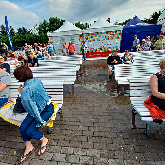 Szczęście mieli Ci, którzy na ten koncert przyszli znacznie wcześniej i zdołali zając miejsca w ławkach bliżej sceny. Kolejni musieli albo brodzić w wodzie albo kombinować gumiaki. Przyjezdni z większym dystansem podeszli do tematu. „Była ulewa-musi być mokro"- komentowali. Mieszkańcy za to, nie kryli niezadowolenia; "Tyle pieniędzy wydaliśmy na taki bubel"- mówił starszy mężczyzna, który nie zdecydował się siadać „w wannie".