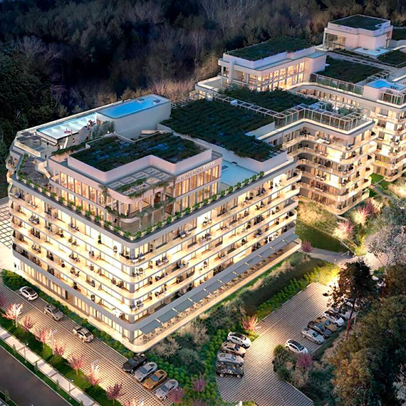Apollo Resort to nowoczesny 5 - gwiazdkowy apartamentowiec składający się z trzech budynków: budynku hotelowego i dwóch budynków apartamentowych. W środku znajdziemy restauracje, bary, kawiarnie, baseny na dachu, strefę SPA, strefę Fitness, a także salę konferencyjną, wyjątkowe tarasy na dachu budynku oraz salę zabaw dla dzieci. Zmotoryzowani goście będą mogli liczyć na miejsca parkingowe.