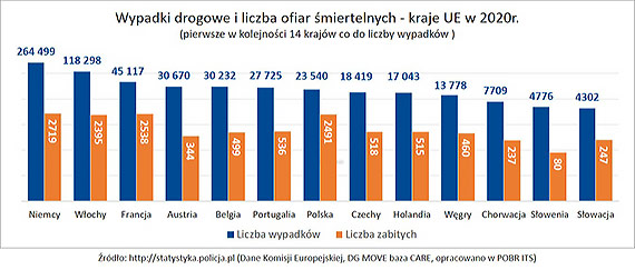 W statystykach wypadków drogowych w krajach Unii Europejskiej za 2020 r. Polska ze względu na liczbę wypadków znajduje się na 7 pozycji. Jednak biorąc pod uwagę liczbę zabitych w takich zdarzeniach znajdujemy się już na 3 pozycji z liczbą 2491 ofiar śmiertelnych. Na pierwszym miejscu znajdują się Niemcy, zaraz za nimi Francja, a na czwartym miejscu uplasowały się Włochy.