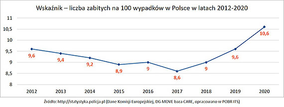 Jednak jeśli zagłębimy się dalej w analizę, sytuacja okazuje się jeszcze bardziej niepokojąca. Albowiem od 2015 roku wskaźnik osób zabitych przestaje maleć, a zaczyna rosnąć! W okresie od 2012 do 2020 w sumie wzrósł z 9,6 do 10,6. W praktyce oznacza to, że ok. 235 osób więcej rocznie zmarło w wyniku zdarzeń drogowych.