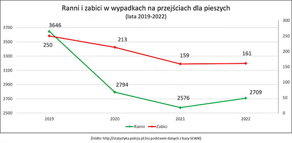 Patrząc na tendencję ostatnich 4 latach, liczba ofiar śmiertelnych na przejściach dla pieszych rok do roku malała o dobrych kilkanaście procent – w roku 2020 o 14,8%, w roku 2021 o 25,35%, aż w roku 2022 wzrosła o 1,26%.