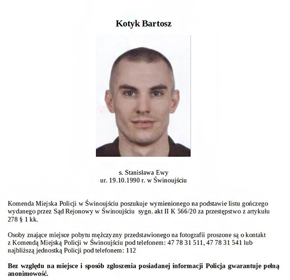 Osoby znające miejsce pobytu poszukiwanych proszone są o kontakt z Komendą Miejską Policji w Świnoujściu pod numerami telefonu: 47 78 31 511 lub 47 78 31 541. Zapewniamy anonimowość.