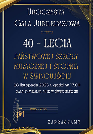 Organizatorzy serdecznie zapraszaj± absolwentów, rodziców oraz sympatyków szko³y na uroczysty koncert w wykonaniu absolwentów, uczniów i nauczycieli. Wydarzenie odbêdzie siê 28 listopada 2025 r. o godz. 17.00 w Sali Teatralnej MDK w ¦winouj¶ciu.