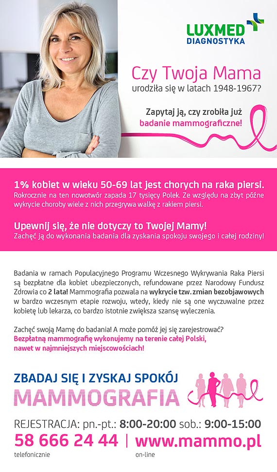 Niespe³na po³owa uprawionych Polek zg³asza siê co roku na badania mammograficzne w ramach Populacyjnego Programu Wczesnego Wykrywania Raka Piersi nadzorowanego przez Ministerstwo Zdrowia. To niewielki odsetek w porównaniu do innych pañstw, gdzie w badaniach mammograficznych uczestniczy ponad 70 % uprawnionych pañ. Warunkiem skuteczno¶ci Programu jest jego masowo¶æ, d³ugoterminowo¶æ i wysoka jako¶æ. Jego waga i znaczenie dla zdrowia i ¿ycia Polek jest nie do przecenienia. Kobiety w wieku 50 – 69 lat s± bowiem najbardziej nara¿one na ryzyko zachorowania.czytaj