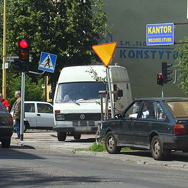 Samochód policyjny próbowa³ wymin±æ siê z nadje¿d¿aj±cym z naprzeciwka samochodem dostawczym. Z powodu zalegaj±cego na poboczu ulicy ¶niegu kierowcy nie zmie¶cili siê i zahaczyli lusterkami.czytaj