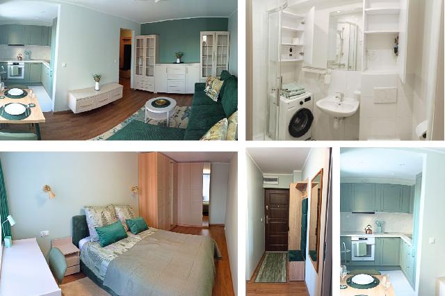 Powierzchnia 42m2 salon z aneksem kuchennym, sypialnia z wyj¶ciem na balkon, du¿± szaf± i ³ó¿kiem 160cm, ³azienka z kabin± prysznicow±. Kolorystyka zieleñ +kaszmir.