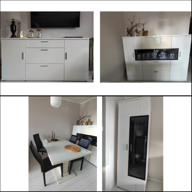 Sprzedam komplet mebli do salonu jadalni firmy Bydgoskie Meble. Meble bardzo solidne, maj± oko³o 10 lat. Stan oceniam na cztery plus. Na komplet sk³adaj± siê wysoka witryna z pod¶wietleniem szklanych pó³ek (wys 202, szer 70, g³êb 42), wysoki kredens z przeszkleniem (wys 147, szer 180, g³êb 42), ni¿szy kredens (wys 90, szer 180, g³êb 42), stó³ z blatem pokrytym szk³em. Stó³ ma mo¿liwo¶æ roz³o¿enia blatu o dodatkowy modu³. (wys 78, szer 90, d³ugo¶æ 140 + 50). W komplecie cztery krzes³a oraz pufa (wys 42, szer 70, d³ugo¶æ 50), pokryte szar± tapicerk±. Ca³o¶æ do zobaczenia na miejscu po wcze¶niejszym umówieniu siê na dogodny termin. Nie zapewniam transportu mebli. Cena za ca³y komplet to 2000 z³.