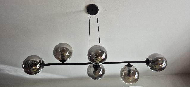 Sprzedam designerski ¿yrandol w bardzo dobrym stanie (kupiony w ub. roku) szer. 110 cm, 6 grafitowych szklanych kloszy o ¶r. 15 cm rama z metalu. Cena 350 z³ (kosztowa³ 774,- z³)