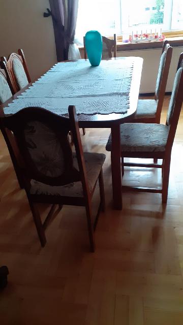 Sprzedam stó³ (wymiary: 160x 90 cm przed roz³o¿eniem) z 6 krzes³ami.